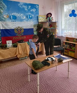 22 февраля в подготовительной группе №1 «Аленушка» состоялась встреча – досуг «Есть такая профессия – Родину защищать». На встречу пришел курсант РА Кирилл О. Он рассказал о службе в вооруженных силах РФ, показал основные навыки строевой подготовки. Ребята рассмотрели форму, отличительные знаки, учились надевать предметы экипировки. Это событие вызвало у детей живой интерес к профессии военного, чувство гордости и патриотизма.